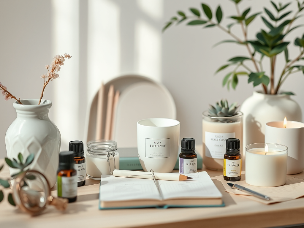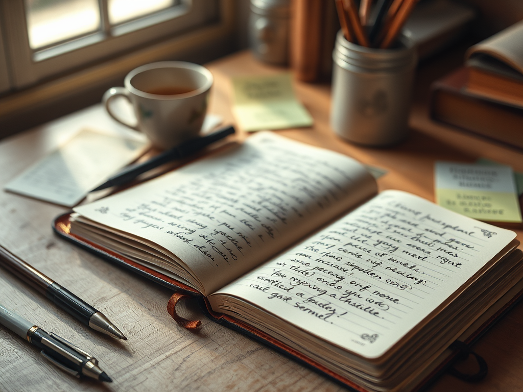 A cozy workspace with a notebook filled with handwritten notes, a cup of tea, and pens, perfect for reflection and emotional wellness during menopause.